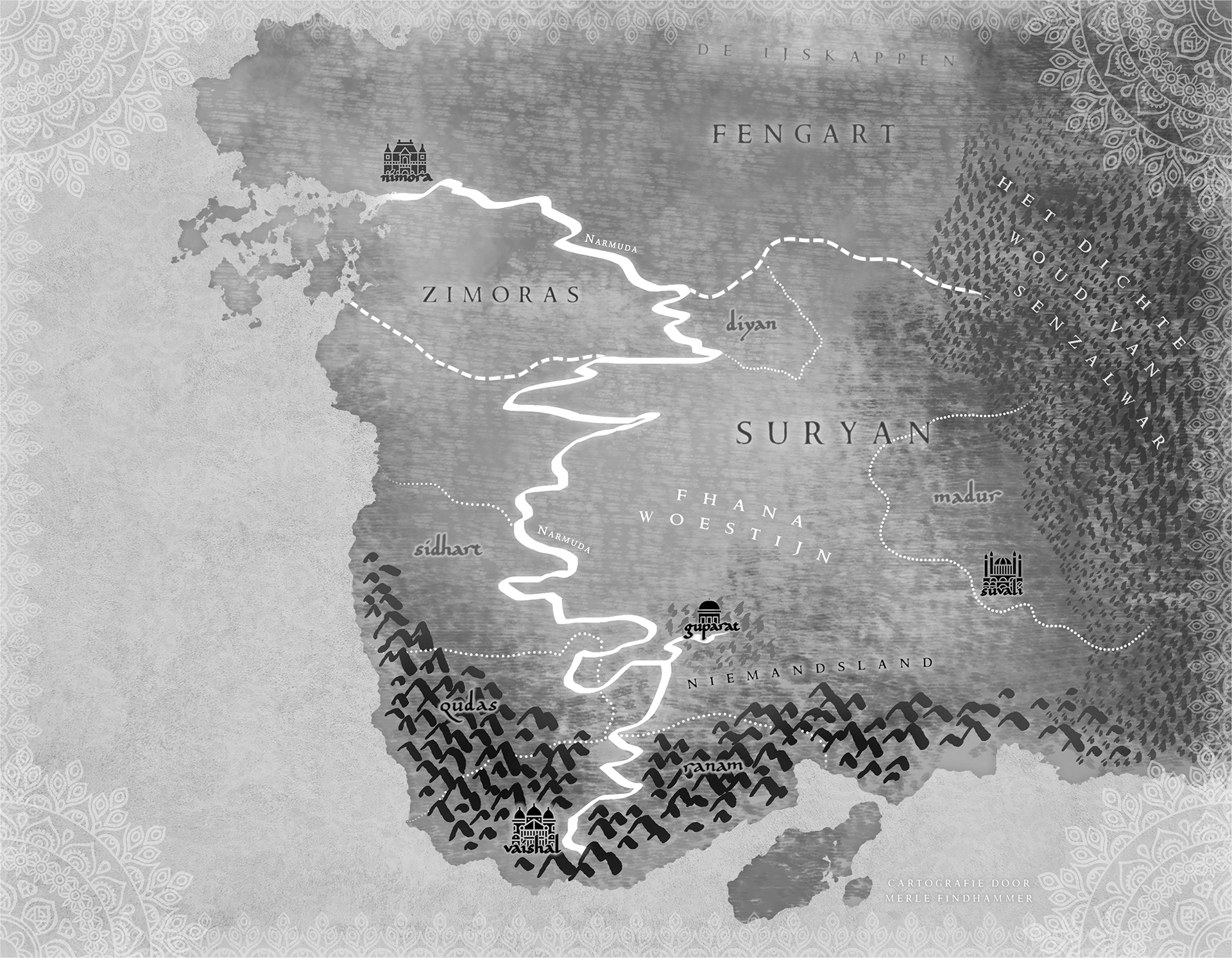 De Zwendelprins is a Dutch fantasy adventure novel taking place in Suryan, a fictional medieval India, in which the main characters travel through the world and explore many places. Therefore publishing house Moon Young Adult requested a fictional map that would provide a visual to the world the author created.
